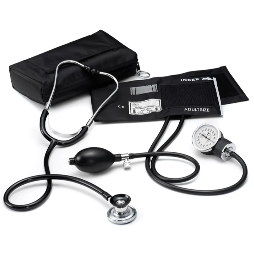Economical Aneroid Sphygmomanometer / SpragueLite combination kit. The SpragueLite provides all of the diagnostic functions of the traditional five-in-one Sprague-Rappaport stethoscope, but with significantly less weight. Black only.